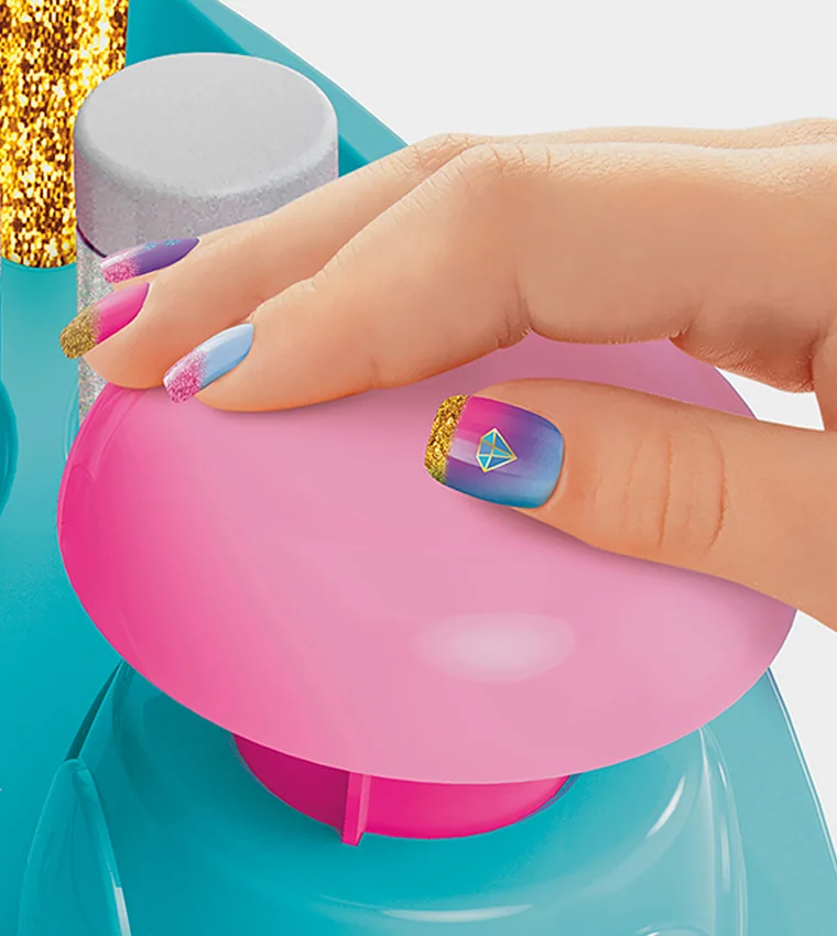 - Shimmer ‘n Sparkle Airbrush Designer vous permet de créer facilement des effets aérographe cool sur vos ongles – il suffit de polir puis de faire preuve de créativité et d’aérographe sur votre design.