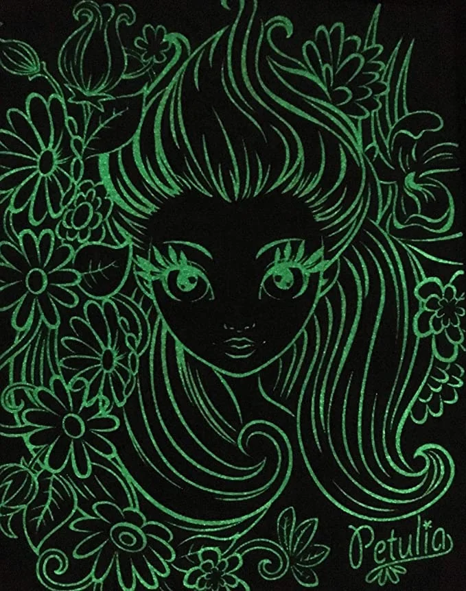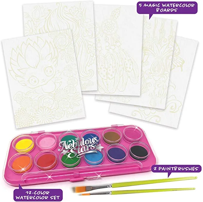 Peignez comme par magie 5 belles toiles. Le dessin au trait pré-verni qui brille dans le noir aide l’aquarelle à rester dans les bonnes zones.