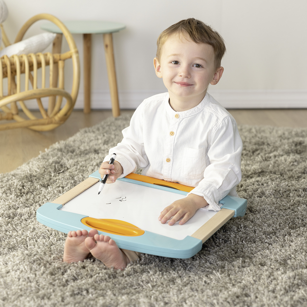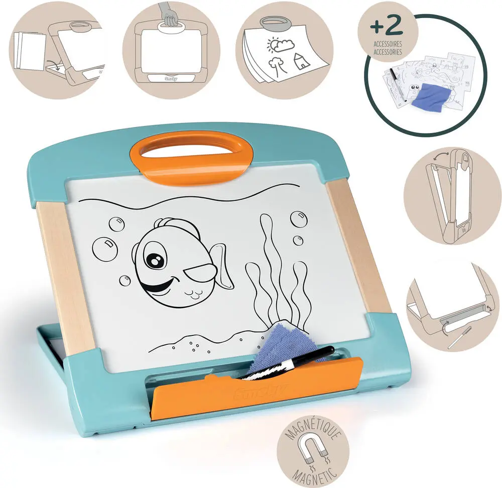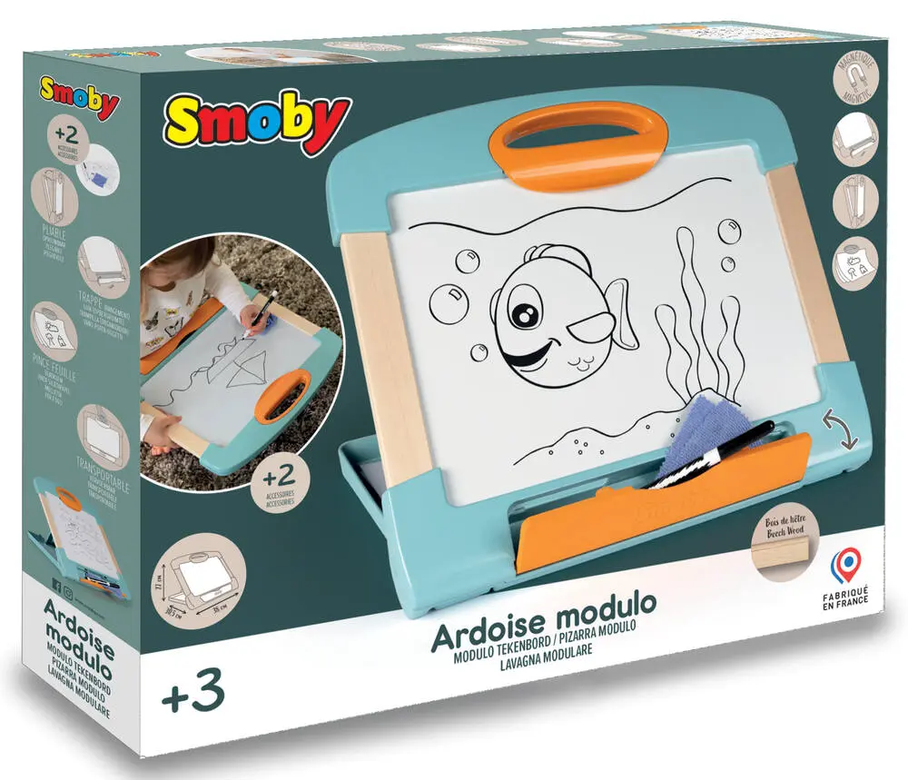 L’ardoise modulo composée de bois et de plastique poséde une face blanche magnétique pour écrire au feutre effaçable. Inclus : 1 tableau d’écriture, 1 stylo feutre effaçable, 1 chiffon. Dispose d’un poignée facilitant le transport.