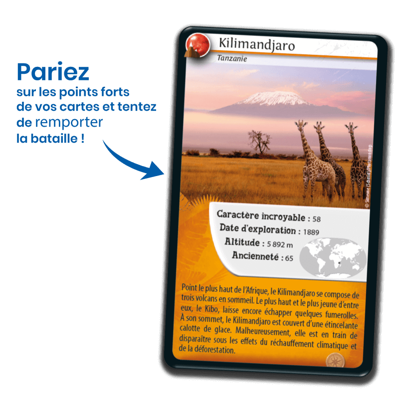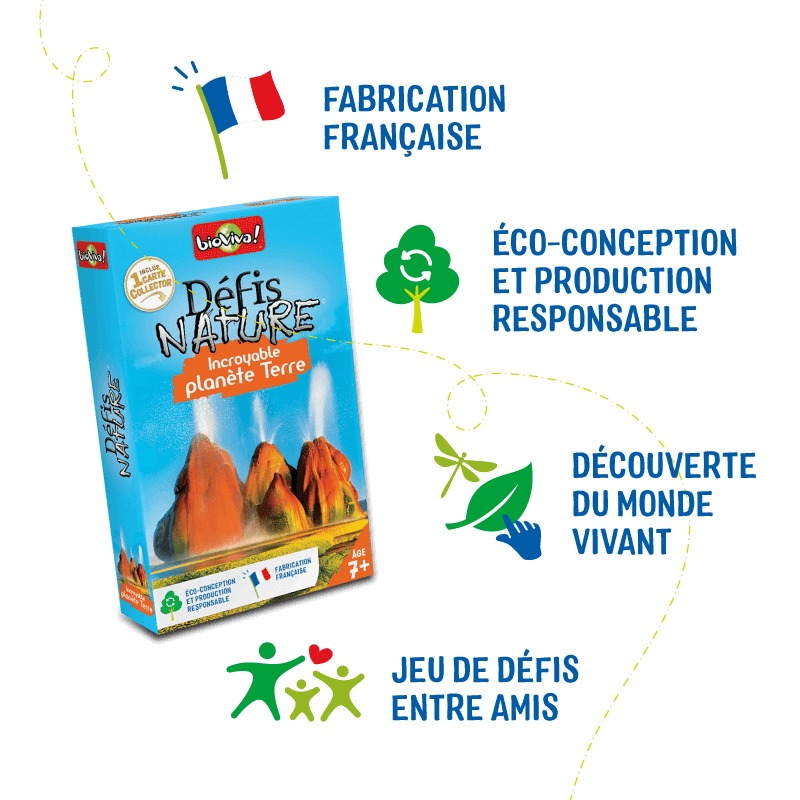 ✓ De 2 à 6 joueurs. ✓ Dès 7 ans. ✓ Durée d’une partie : 20 min. ✓ Fabriqué en France et éco-conçu. En ce moment uniquement sur Bioviva.com : 4 jeux de cartes Défis Nature (au choix) achetés = 1 Défis Nature – Pack cartes brillantes Platine OFFERT. Ajouté automatiquement à votre panier. Défis Nature – Incroyable planète Terre vous emmène à la découverte des merveilles de la nature ! Découvrez les caractéristiques des sites, puis pariez sur leurs points forts pour collecter toutes les cartes du jeu et remporter la partie. Alors, prêts à relever le défi ?…