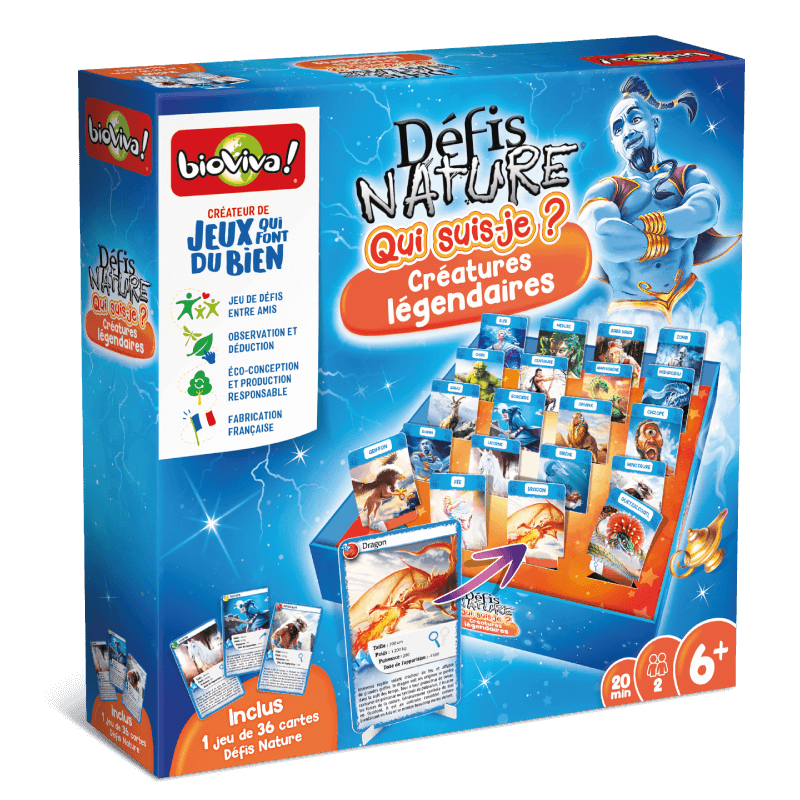 BUT DU JEU DE DÉFIS NATURE QUI SUIS-JE ? CRÉATURES LÉGENDAIRES ✓ 2 joueurs. ✓ Dès 6 ans. ✓ Durée d’une partie : 20 min. ✓ Fabriqué en France et éco-conçu. Menez votre enquête pour trouver la créature légendaire de la carte Défis Nature de votre adversaire. Posez des questions et retirez de votre plateau les créatures légendaires au fur et à mesure. Saurez-vous trouver la créature légendaire mystère de votre adversaire en premier ? Ruse et logique seront vos alliées ! Alors prêts à relever le défis ?