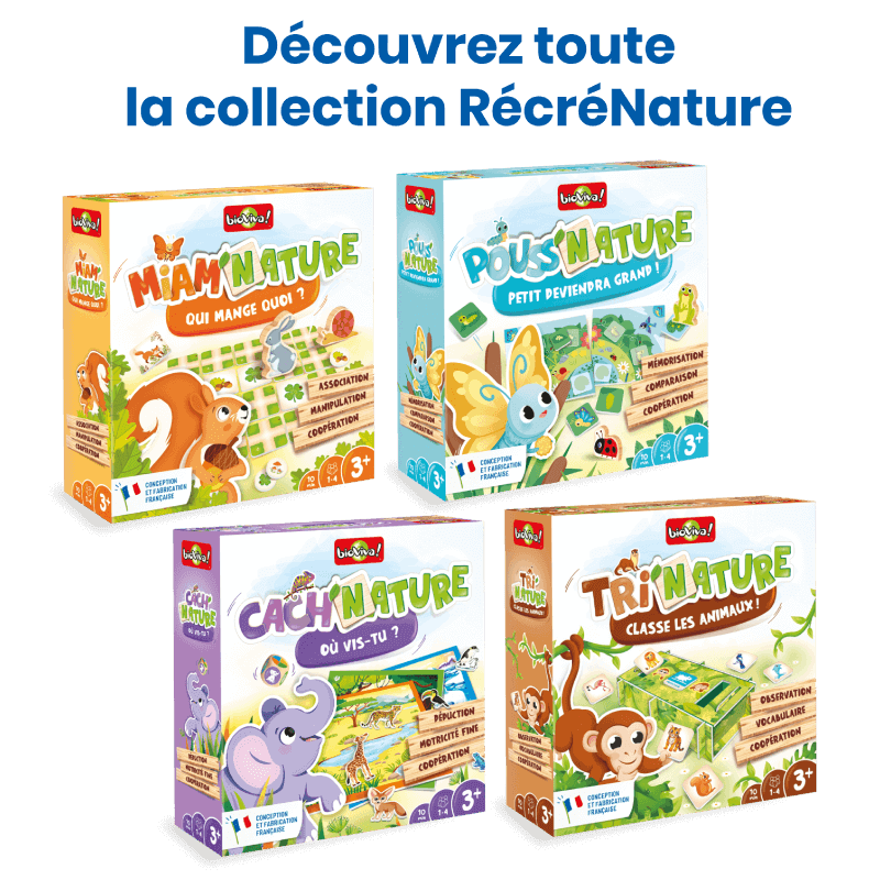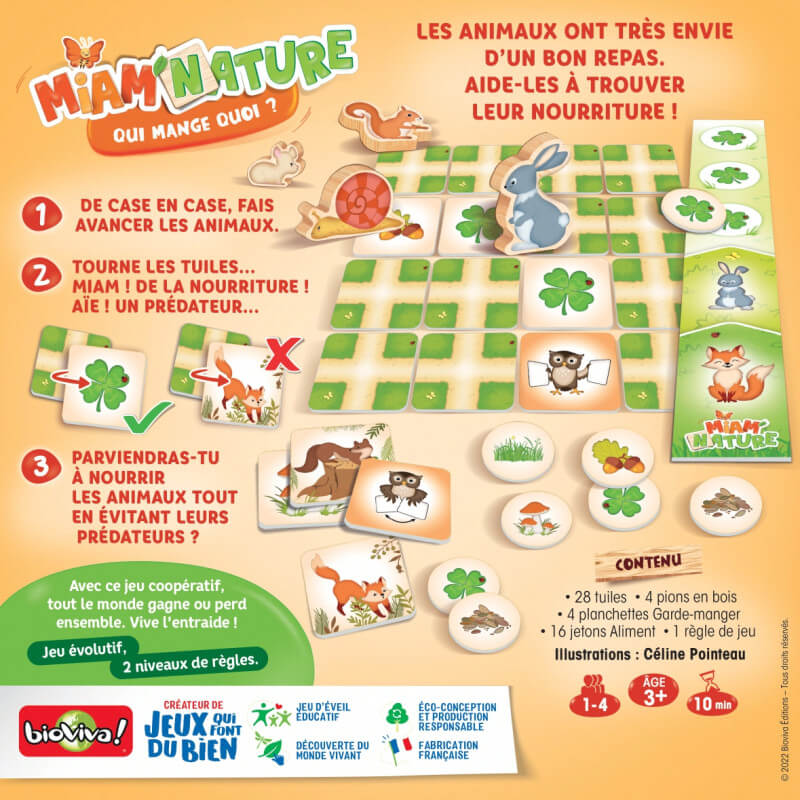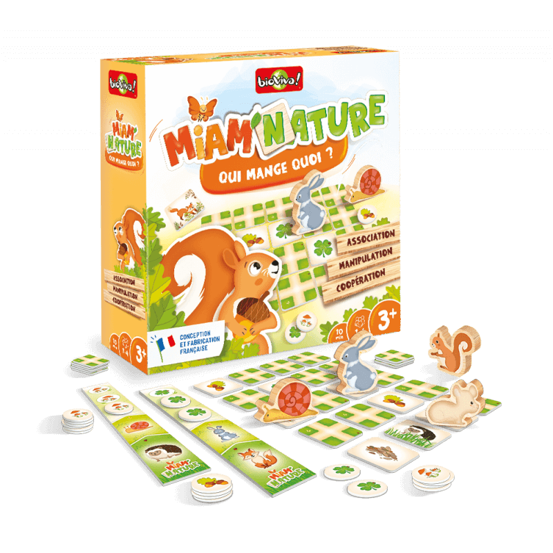 BUT DU JEU DE MIAM’NATURE, QUI MANGE QUOI ? ✓ De 1 à 4 joueurs. ✓ Dès 3 ans. ✓ Fabriqué en France. Les animaux ont très envie d’un bon repas. Aide-les à trouver leur nourriture ! Comment jouer ? L’escargot, le lapin, la souris et l’écureuil ont faim. Tous ensemble, les joueurs tentent de remplir au moins deux de leurs garde-manger. Pour cela, les joueurs déplacent les animaux de tuile en tuile le long des chemins pour trouver les aliments correspondants à chacune des espèces. Mais gare aux prédateurs qui rôdent et à la nuit qui tombe… Si deux…