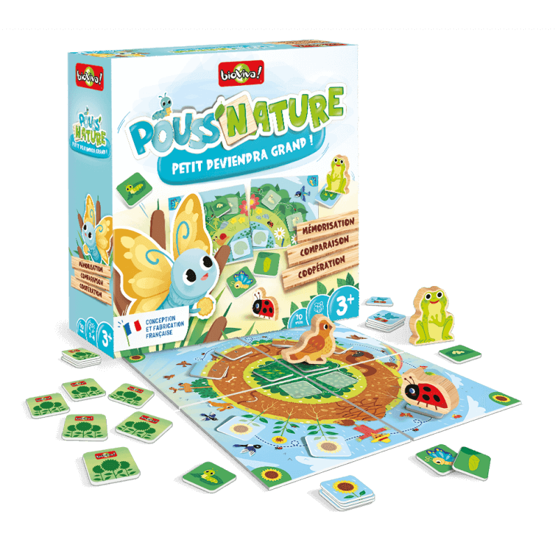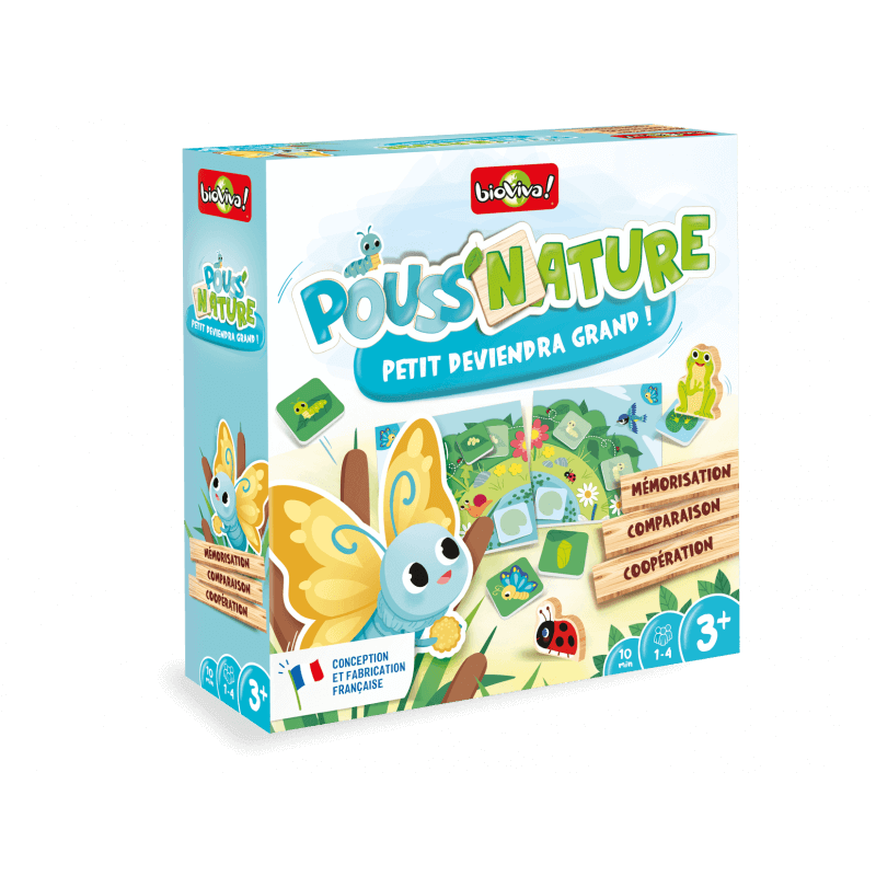 BUT DU JEU DE POUSS’NATURE, PETIT DEVIENDRA GRAND ! ✓ De 1 à 4 joueurs. ✓ Dès 3 ans. ✓ Fabriqué en France. De la graine à la fleur, de l’œuf au papillon… découvre leur croissance en t’amusant ! Comment jouer ? Les enfants observent et mémorisent les tuiles représentant les étapes du cycle de vie du papillon ou de la fleur, puis les retournent face cachée. Arriveront-ils à les retrouver dans le bon ordre et faire de la chenille un joli papillon ou de la graine un grand tournesol ? Mais gare aux prédateurs qui rôdent et qui progressent…