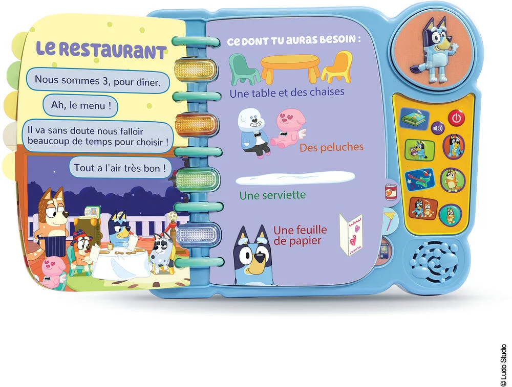 Un livre ludique et interactif pour apprendre en s’amusant avec Bluey et sa famille ! Contient 1 livre de 15 pages illustrées pour écouter et découvrir 7 activités à reproduire en famille, basées sur les épisodes de la série. Avec 7 pages pour découvrir les lettres et des mots de vocabulaire et 7 touches sensitives pour faire le plein de découvertes. Découvrez 4 modes de jeu : lecture, découverte, musique et observation ainsi que 3 boutons personnage pour écouter des anecdotes. Avec 4 boutons lumineux pour suivre l’histoire pas à pas et 1 bouton Bluey pour entendre la voix des personnages et des sons amusants. Une poignée adaptée aux petites mains qui permet d’emporter son livre partout. Avec la vraie voix des personnages. Arrêt automatique. Pile de démonstration fournie