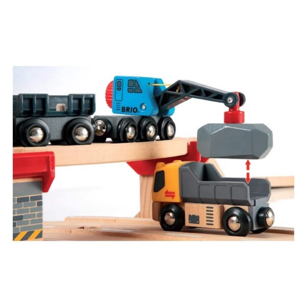 Soulevez et chargez ! Cet ensemble de levage et de chargement routier BRIO regorge de nombreux jeux, notamment deux camions et un train tirant un wagon-grue qui peut soulever des charges sur et hors de la voie ferrée. Retirez les charges de roches du train et chargez-les sur les camions pour un transport routier en toute sécurité jusqu’à la destination finale.Â