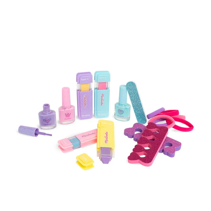 Contenu : 6 élastiques à cheveux + 4 craies à cheveux + 3 vernis à ongles + 2 séparateurs d’orteils + lime à ongles