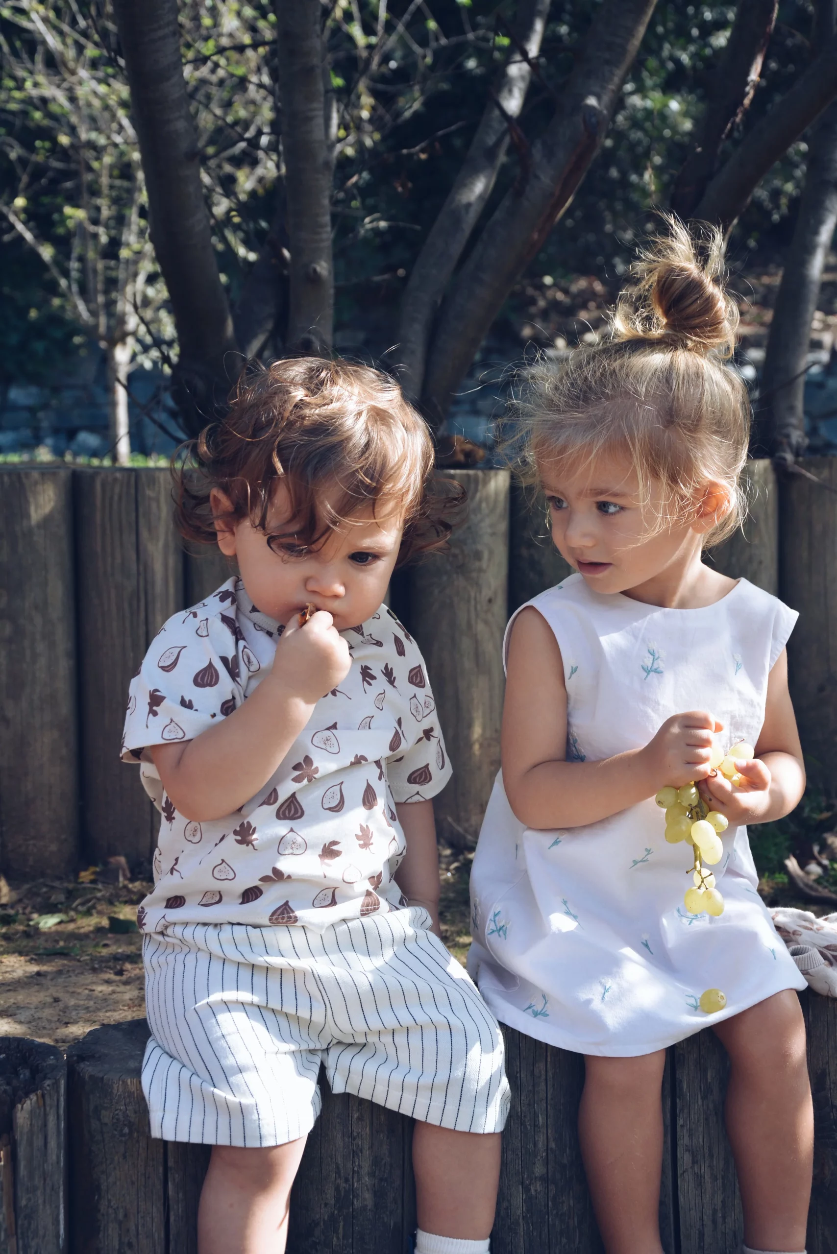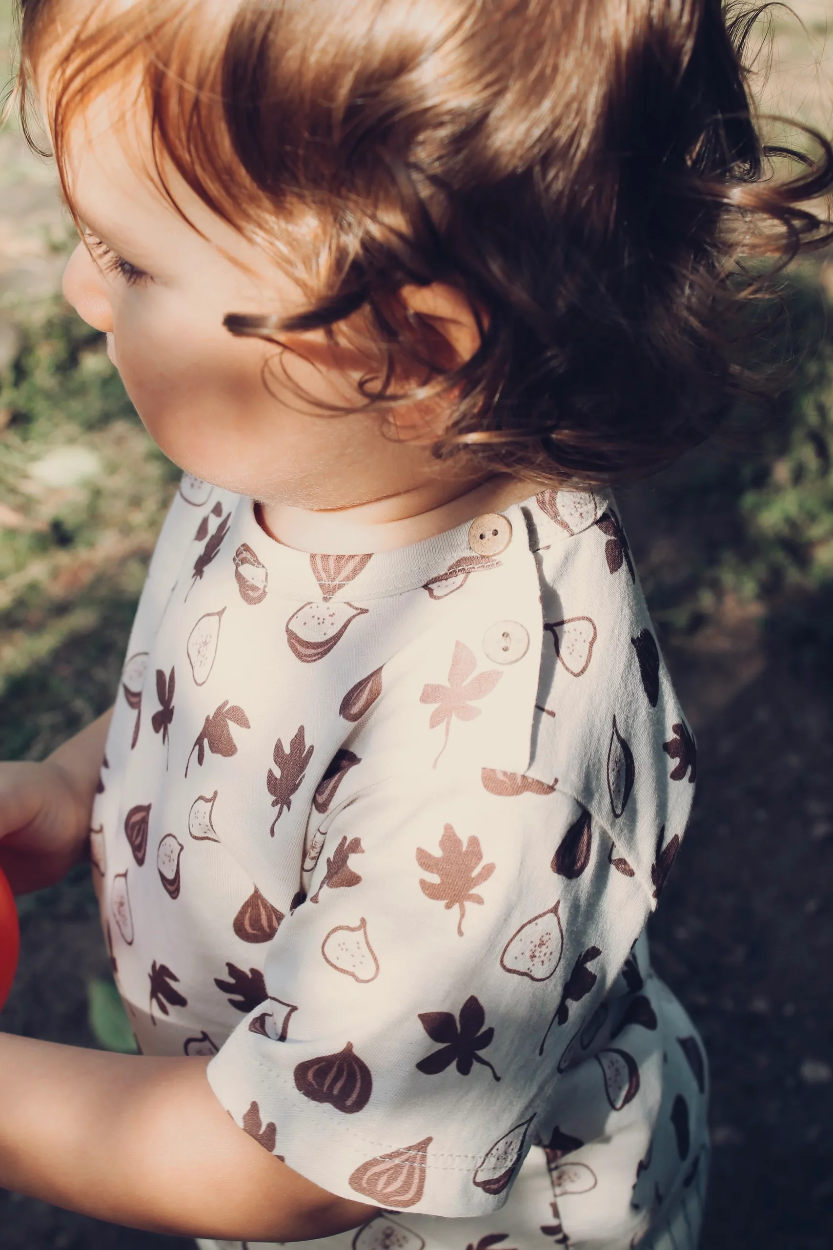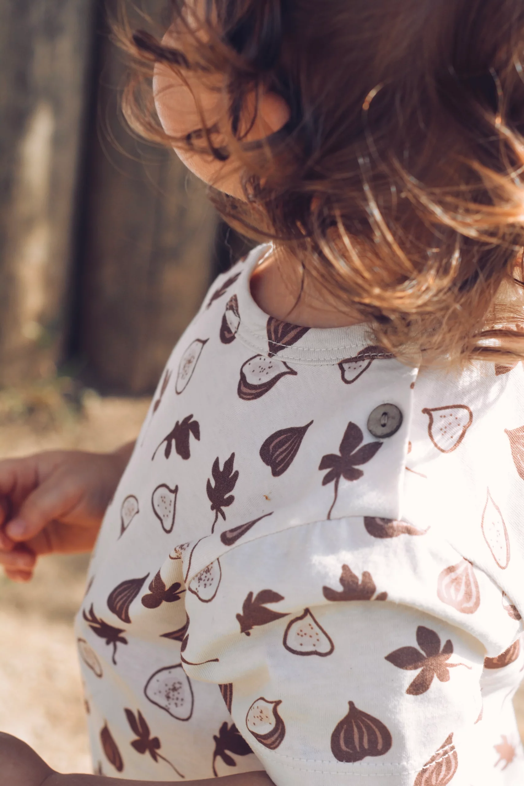 Modèle unisexe Description T-shirt à manches courtes Deux boutons en noix de coco sur l’épaule Encolure ronde Couleur : Beige avec un motif soleil. Composition 100% Coton Tissu certifié OEKO-TEX.