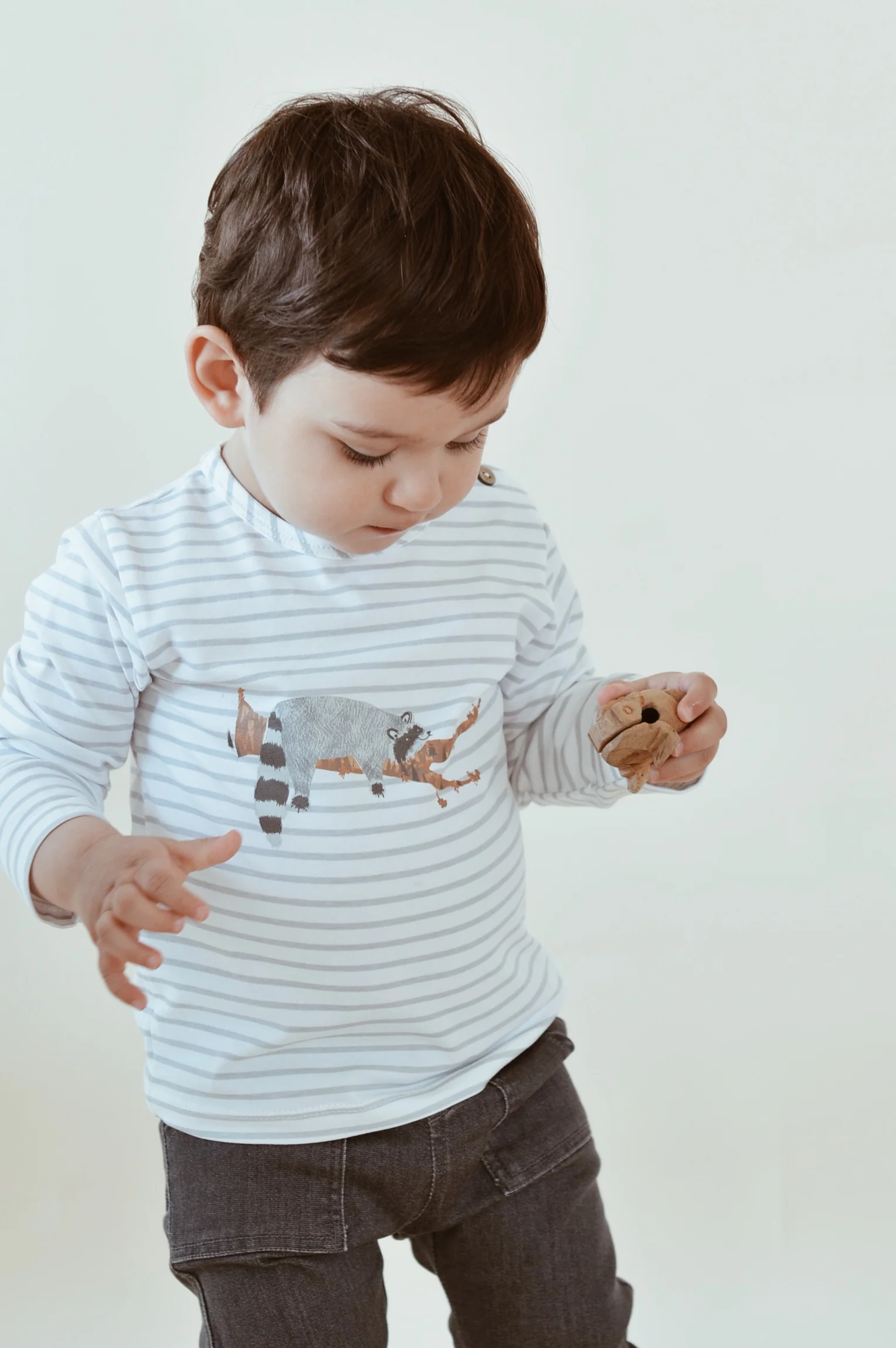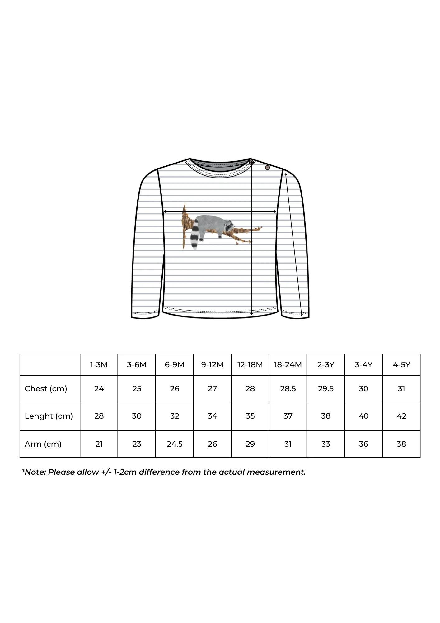 Modèle unisexe Description T-shirt à manches longues Boutons en noix de coco sur l’épaule Imprimé raton laveur Couleur : Rayé blanc et gris. Composition 95% coton, 5% élasthanne Tissu certifié OEKO-TEX.