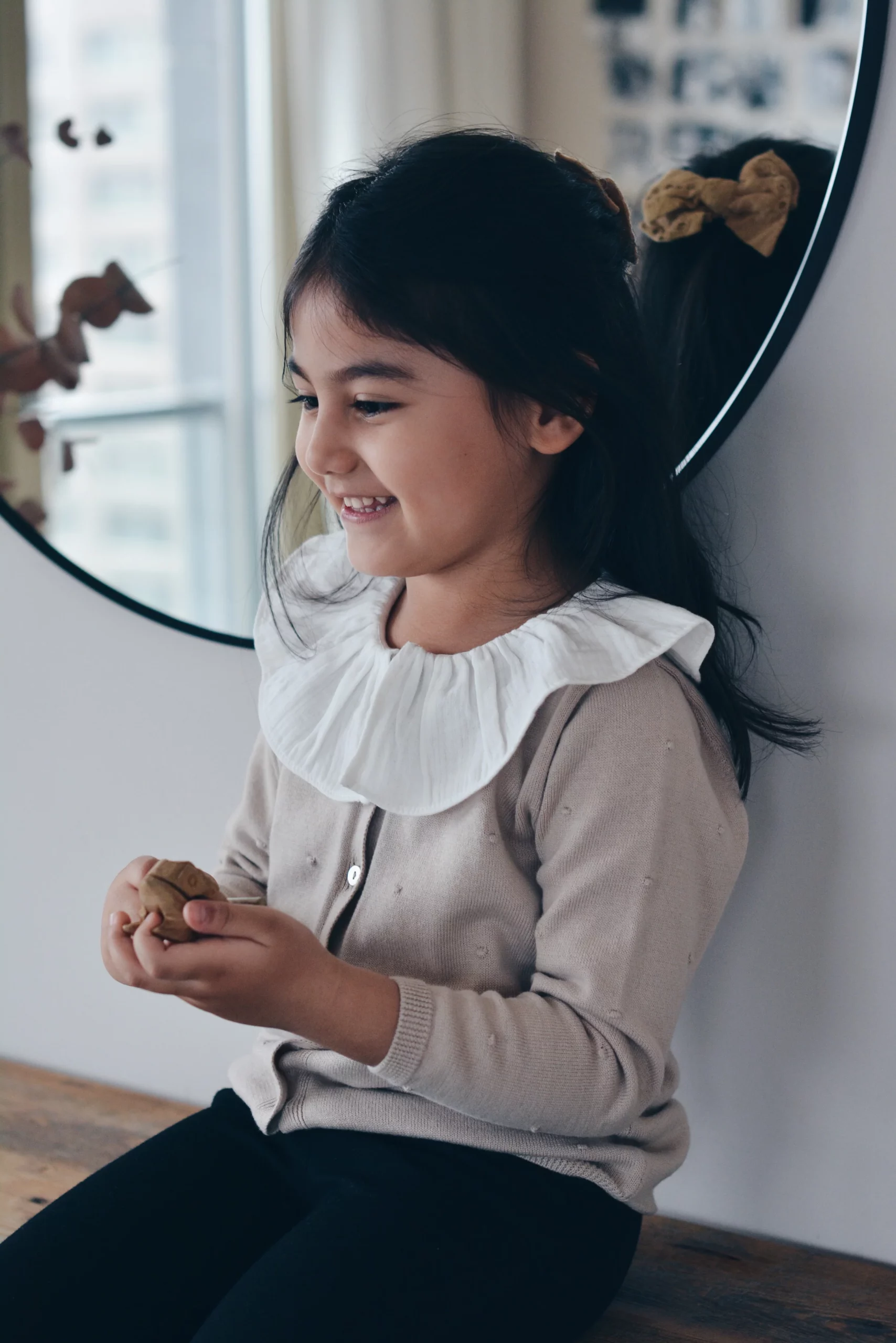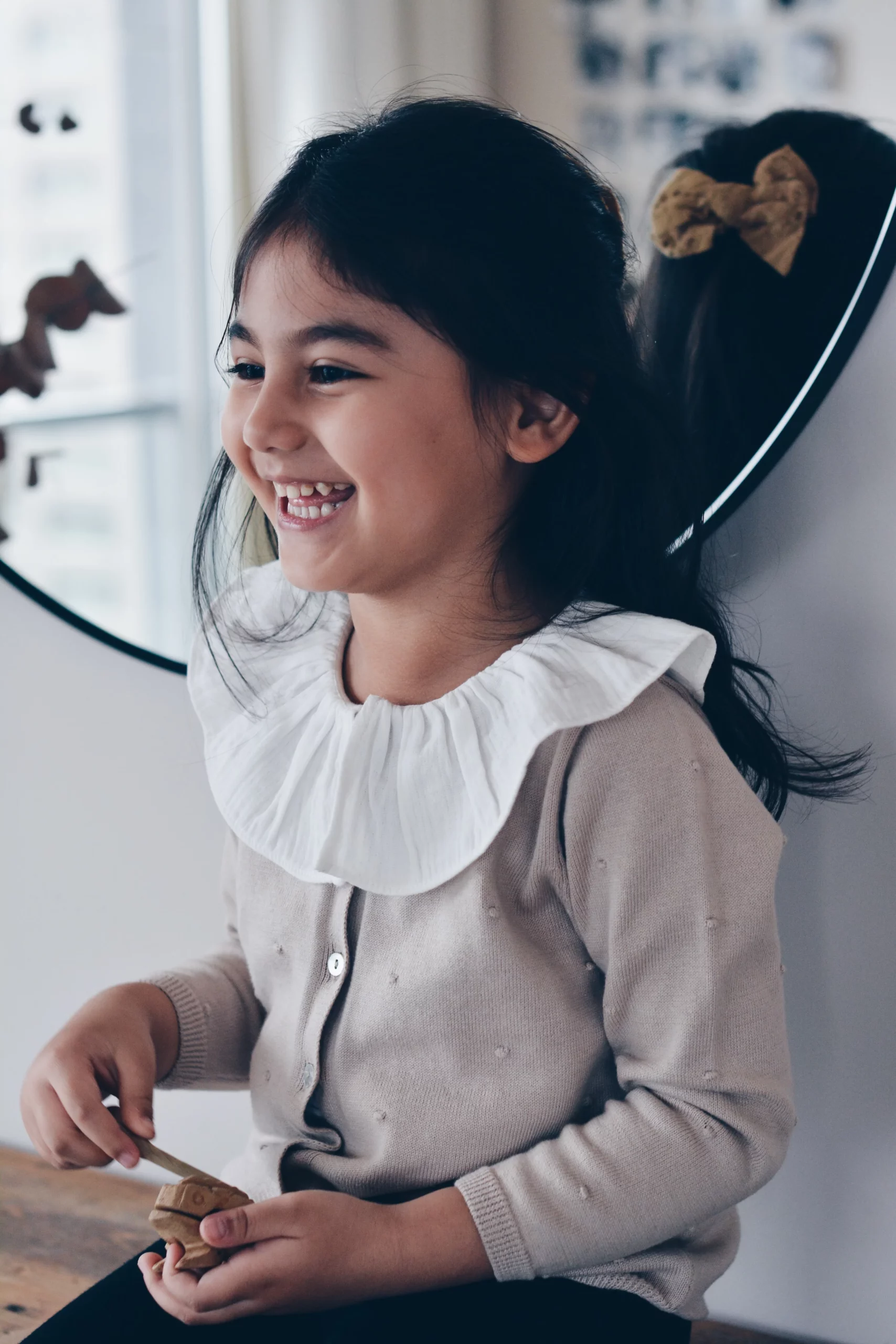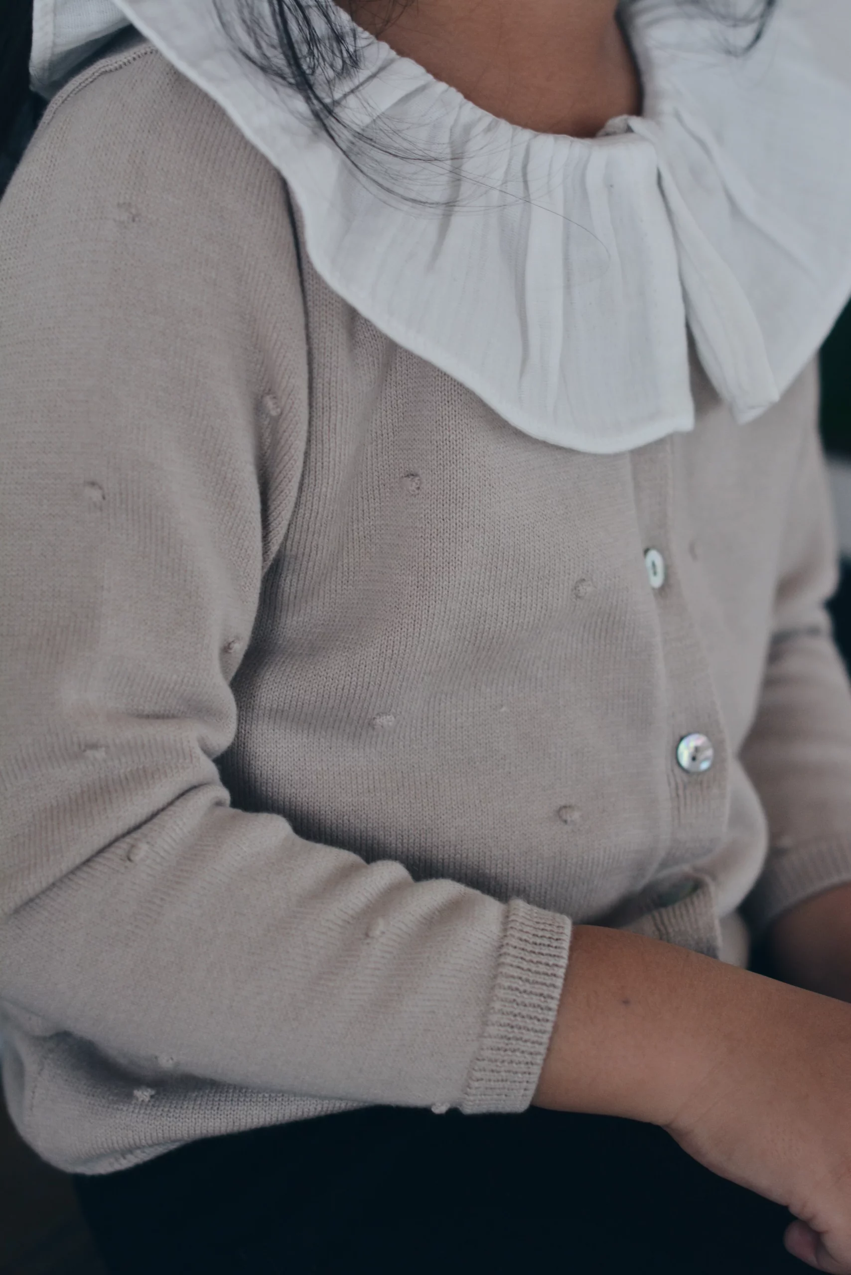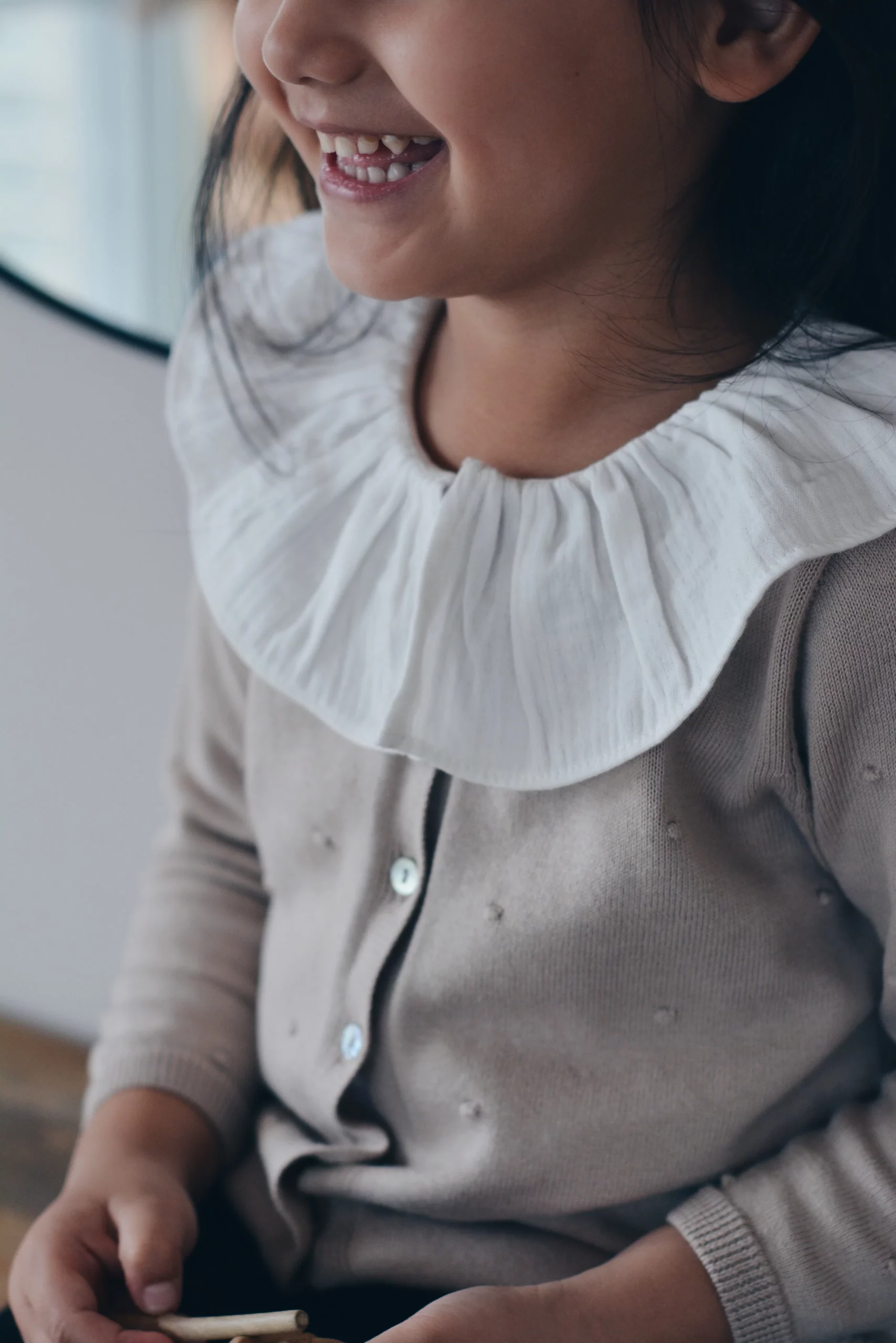 Description Cardigan tricoté avec col en gaze de coton Détails de pois et boutons en nacre sur le devant. Composition 100% Coton. Tissu certifié OEKO-TEX.