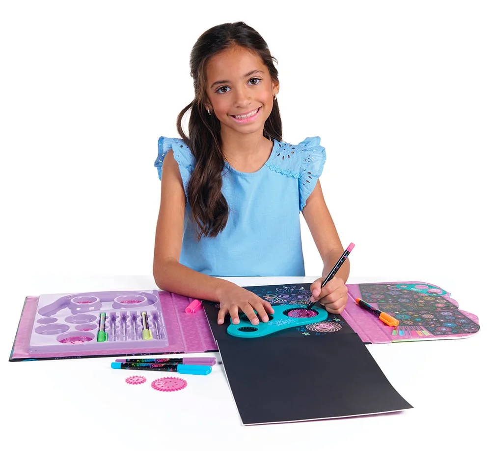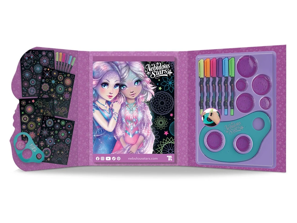 Le pochoir classique en tourbillon voyage vers les étoiles! Créez des tourbillons néon fabuleux avec des stylos-gels et des autocollants brillants autour de vos étoiles préférées en action.