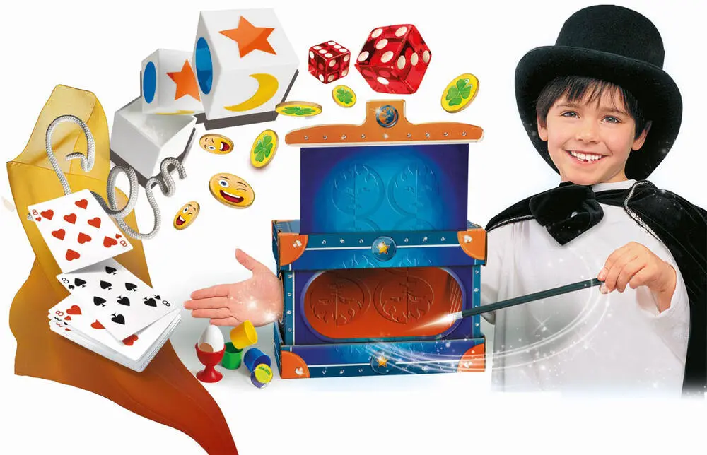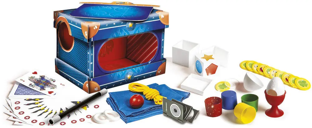 Le caisson magique est un coffret très riche permettant de réaliser un spectacle de magie complet ! L’enfant pourra choisir les tours qu’il souhaite réaliser parmi 80 tours très faciles à exécuter ! Et pour le clou du spectacle : une grande illusion ! Le petit magicien fera disparaître son bras à l’intérieur d’un caisson magique pourtant ouvert et visible de tous ! Votre enfant pourra ainsi s’amuser avec de grands tours classiques de la magie en utilisant des cordelettes, une baguette magique, des cartes et bien plus encore. Un guide complet et illustré, facile à suivre explique toutes les astuces pas à pas. N’oubliez pas que c’est l’entraînement et la répétition qui fera de vous un grand magicien ! Votre enfant pourra épater ses amis et sa famille avec ce coffret de magie et d’illusion.