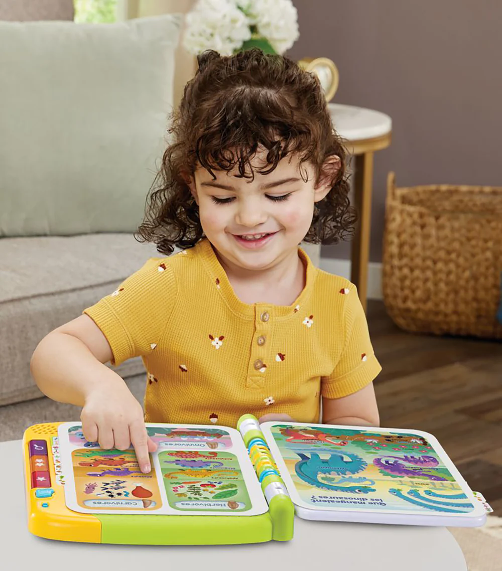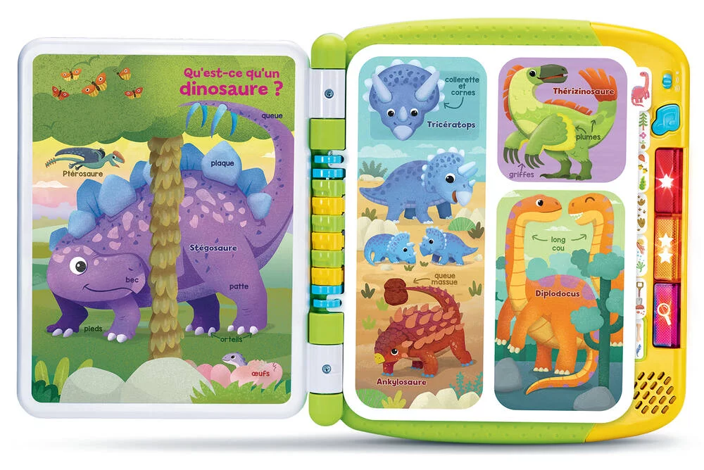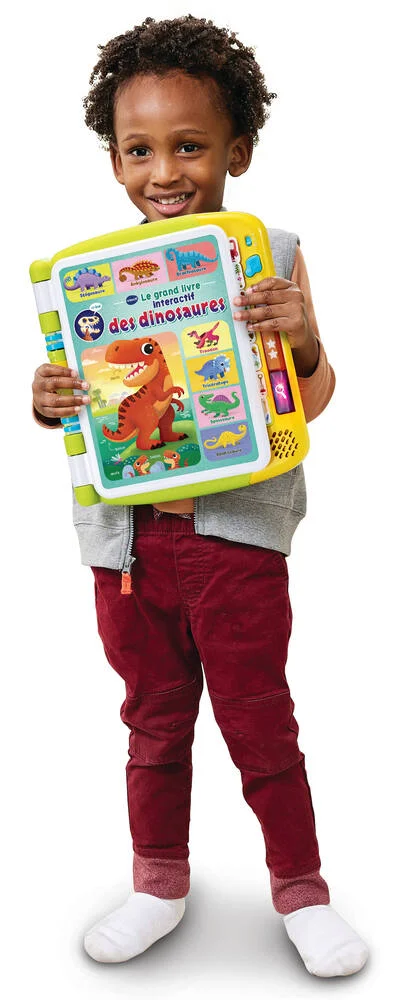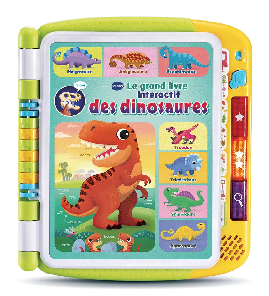 Le grand livre interactif des dinosaures – 3 – 7 ans – Un livre parlant pour découvrir le monde des dinosaures ! Avec ses 7 pages recto-verso, ce grand livre sur le thème des dinosaures est idéal pour faire le plein de découvertes tout en s’amusant. Très complet, il possède + de 200 points d’interaction tactiles qui permettent de déclencher + de 700 phrases et sons réalistes. 3 modes de jeu sont inclus : Exploration : l’enfant parcourt les différentes pages du livre et apprend plein d’informations sur les dinosaures. Expert : l’enfant découvre encore plus d’informations sur le monde des dinosaures pour enrichir ses connaissances. Quiz : l’enfant répond aux questions posées en trouvant les bonnes images. Détection automatique des pages lorsque l’enfant tourne la page. Bouton Musique pour déclencher 9 chansons et des mélodies sur le thème des dinosaures. Arrêt automatique et réglage du volume sonore.