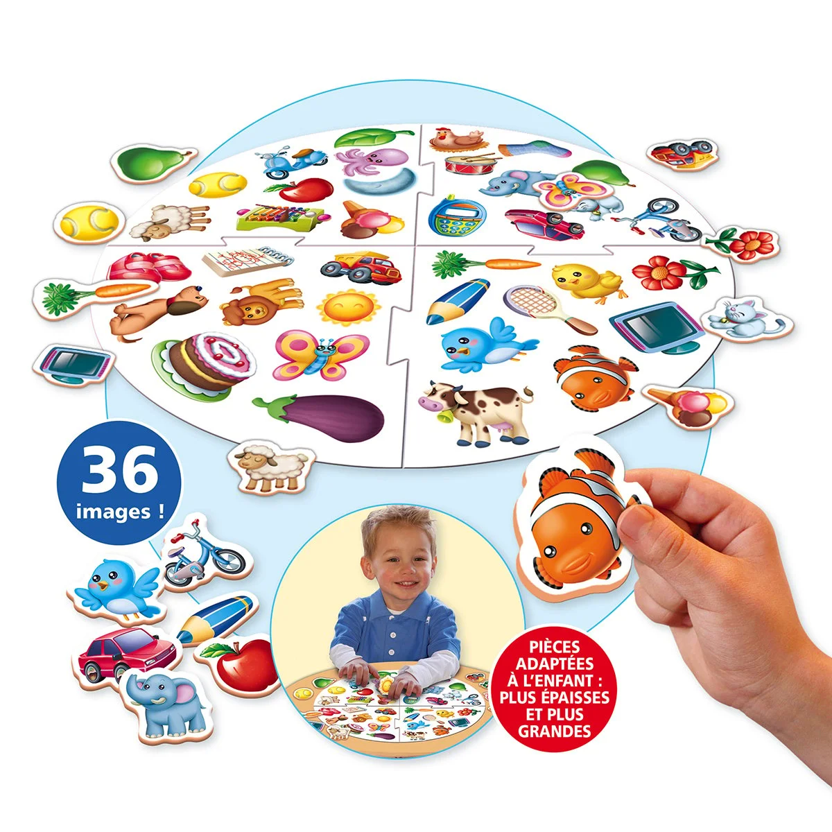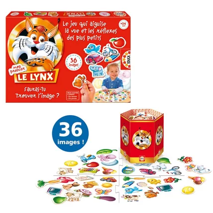 Le passionnant jeu de compétition Le Lynx dans une version adaptée pour les plus petits (2-4 ans). Chaque joueur doit essayer de repérer sur le plateau de jeu les images tirées au hasard. Renforce la mémoire visuelle et les réflexes. Nouvelle dynamique additionnelle pour associer des paires.