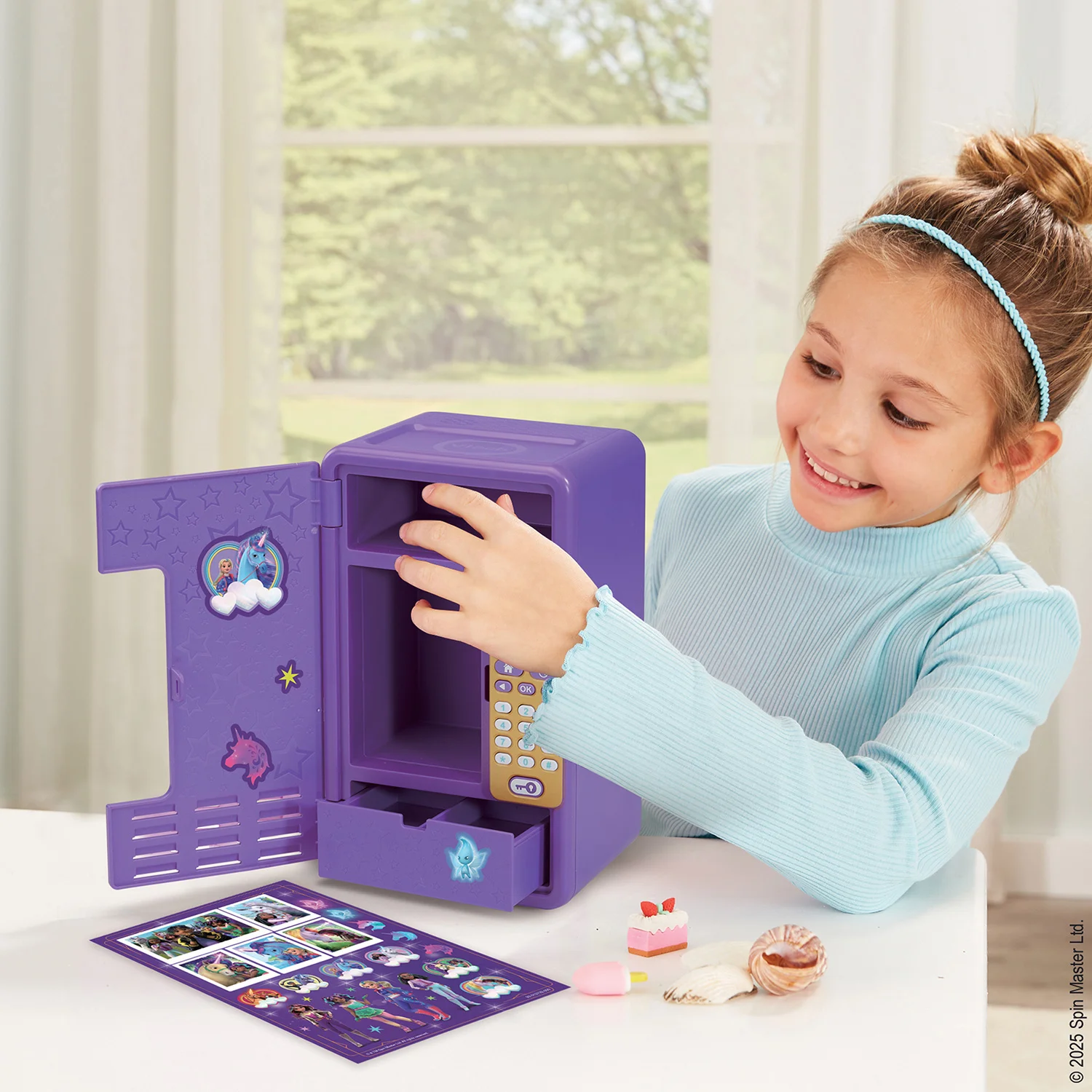 • Magique ! Le casier s’ouvre après avoir entré le code secret à 6 chiffres. À l’intérieur, 2 compartiments et un 1 tiroir à double fond permettent de cacher ses bijoux, ses trésors et petits mots. • Sur l’avant, un écran LCD affiche l’heure et un clavier à 10 chiffres permet d’entrer le code secret mais aussi de jouer à 6 jeux inclus ! On y retrouve également des activités Pouvoirs Magiques et Défis. • 16 chansons et mélodies sont incluses et un câble jack est fourni pour écouter sa musique depuis un smartphone. • 1 planche d’autocollants permet de personnaliser son casier au gré de ses envies, ce qui en fait un objet unique.