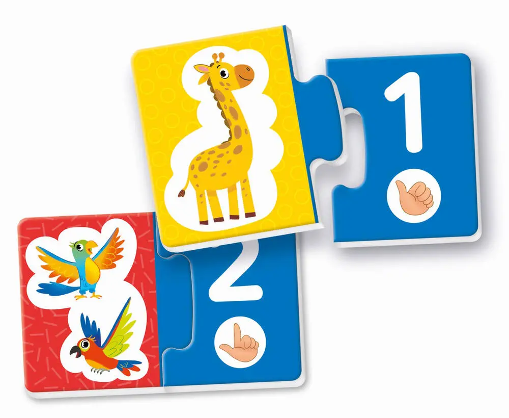 Contient 10 jetons avec des nombres et 10 cartes recto-verso : d’un côté les animaux sont représentés en quantité de 1 à 10 dans leur habitat et de l’autre le nombre et la quantité correspondants. Avec 3 modes de jeu, ce coffret stimule les compétences d’observation et d’association des enfants et leur enseigne les premiers concepts de groupement et de mathématiques.