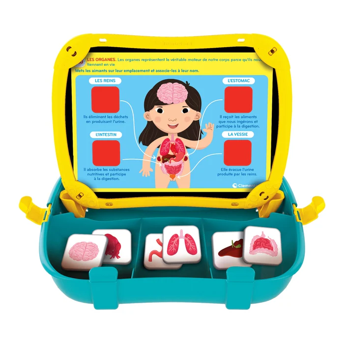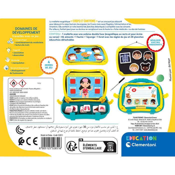 L’enfant pourra s’amuser avec les aimants à travers de nombreuses activités sur le corps humain, les émotions et les vêtements. Le livret inclus propose un parcours éducatif structuré pour guider l’enfant dans son apprentissage. La mallette est pratique à emporter partout avec soi et est dotée de nombreux compartiments pour garder les composants du jeu bien rangés. L’ardoise sur laquelle sont collés les aimants présente un côté sur lequel l’enfant peut écrire avec le feutre effacable fourni.