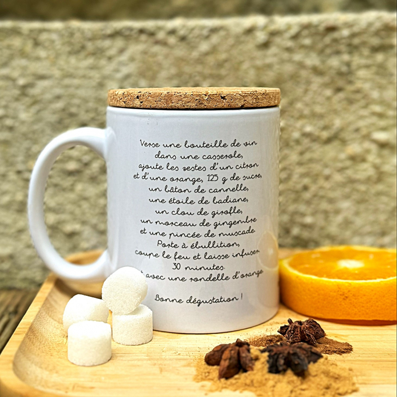 La saison du vin chaud est arrivé ! Découvrez au verso du mug la recette du vin chaud pour vous réchauffer cet hiver. Livré dans une jolie boite en kraft. Avec son couvercle en liège 100% biologique, votre boisson restera bien au chaud, et nous avons pensé à tout afin