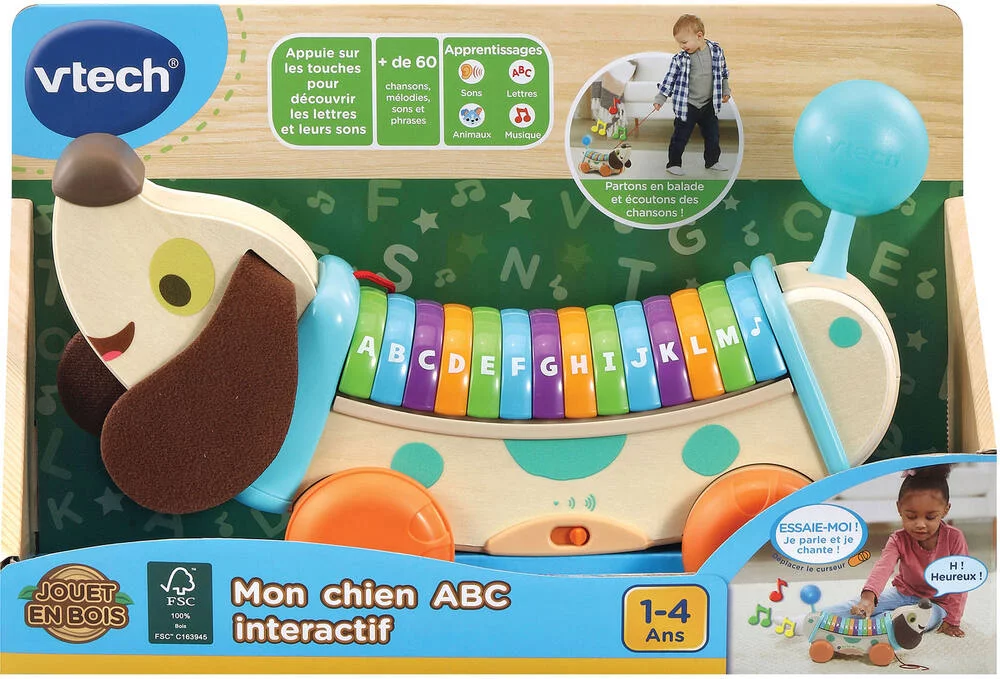 Un chien au look vintage pour découvrir l’alphabet ! • Un chien-piano en bois FSC à faire rouler , au look vintage, qui accompagnera l’enfant dans son apprentissage de l’alphabet et l’aidera à développer sa motricité globale. • Grâce à 28 boutons lettres et découvertes, l’enfant découvrira les lettres, leurs sons ainsi que les mots associés et des anecdotes sur le petit chien. • Le bouton note de musique active 3 chansons différentes. En appuyant sur le bouton chien, l’enfant pourra écouter des petites phrases rigolotes. • Pour encourager l’enfant à avancer, un détecteur de mouvements déclenche des phrases et des chansons dès que l’enfant fait rouler le chien. • Ses oreilles en feutrine sont douces à caresser , sa queue est lumineuse . • Arrêt automatique et réglage du volume sonore.