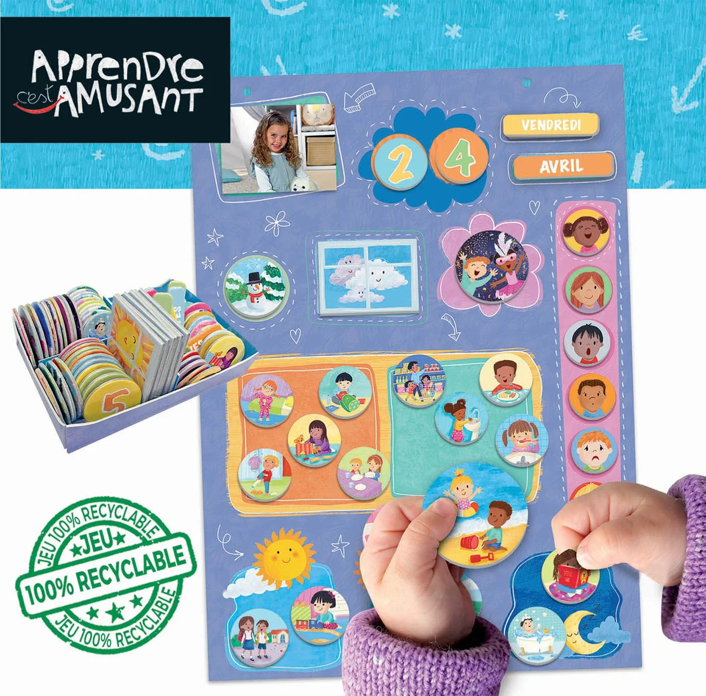 « Apprendre c’est amusant » est une collection de jeux spécialement créés pour accompagner les enfants dans leur processus de croissance et d’apprentissage, en favorisant le développement de leurs capacités, de leurs compétences et de leur personnalité. Le moyen le plus amusant d’apprendre à connaître les jours, les mois et les années, ainsi que les saisons et les activités que nous réalisons au cours de la journée.