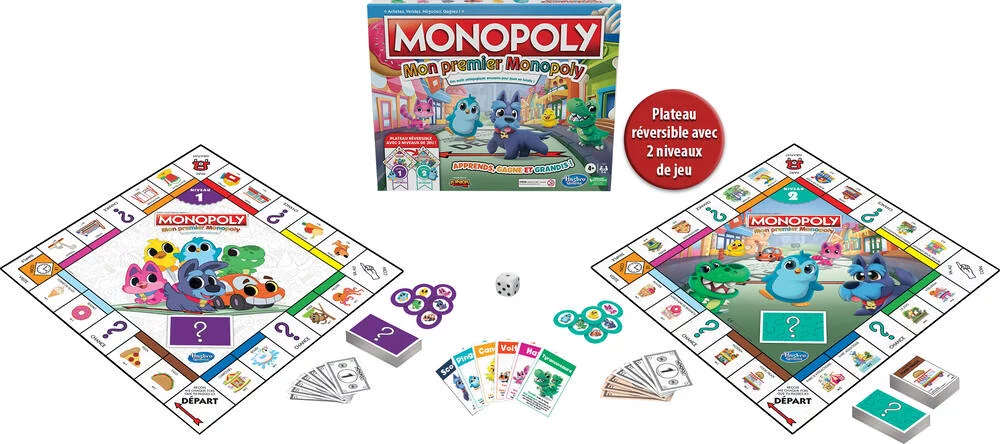 Le plateau de jeu Mon premier Monopoly présente des outils pédagogiques amusants pour jouer en famille. Son plateau réversible a 2 niveaux de jeu, ce qui permet de décider quel niveau convient à sa famille.