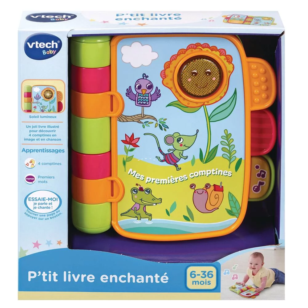 P’tit livre enchanté. Mes premières comptines. De 6 à 36 mois. Livre parlant et musical pour découvrir 4 comptines connues. Deux boutons dont un soleil lumineux, pour déclencher mélodies, chansons et phrases amusantes. Magique ! Les chansons se déclenchent automatiquement quand bébé tourne les pages. 4 chansons et 4 mélodies. Arrêt automatique.