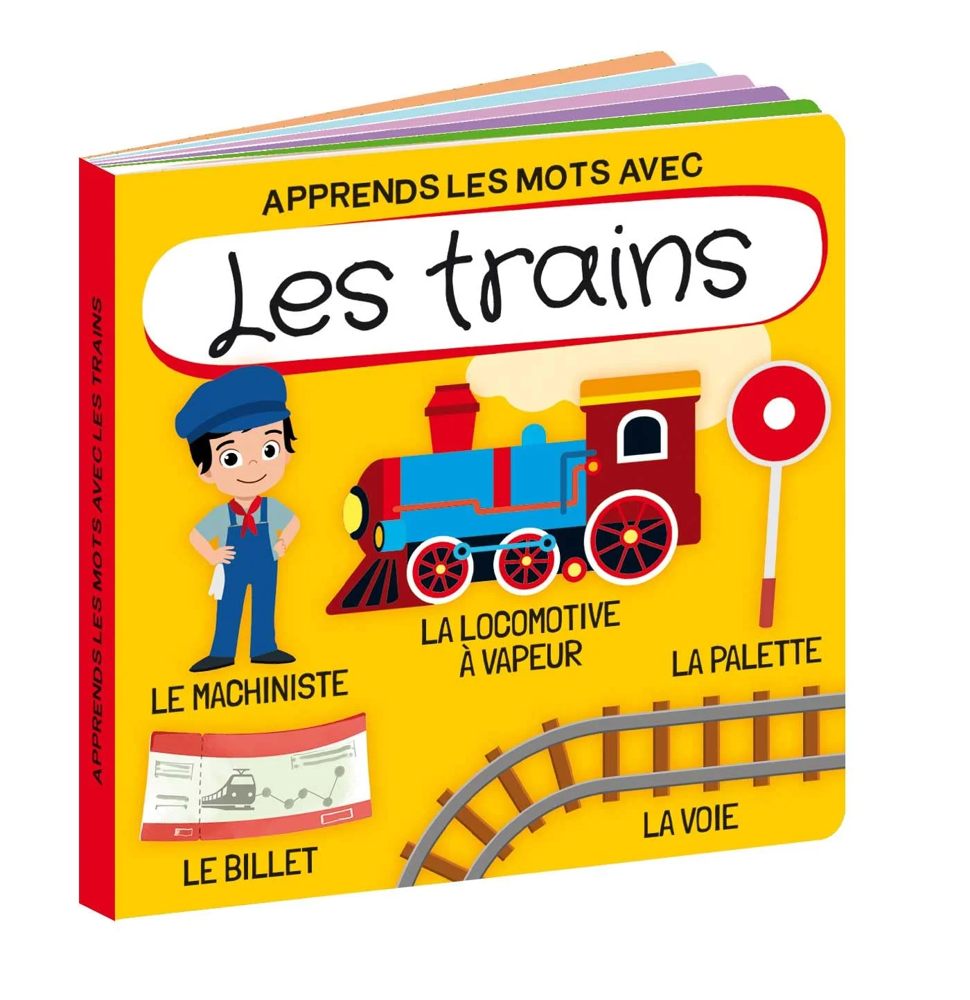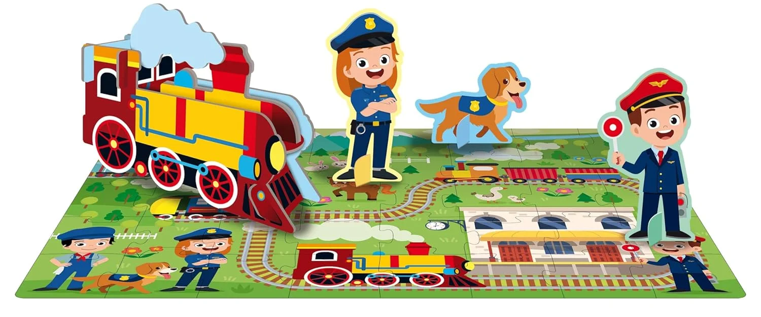La boîte aux détails irisés contient un puzzle de 40 pièces, 3 silhouettes, une locomotive à vapeur à construire et un livre de 10 pages pour apprendre à reconnaître et à associer des éléments et des mots.