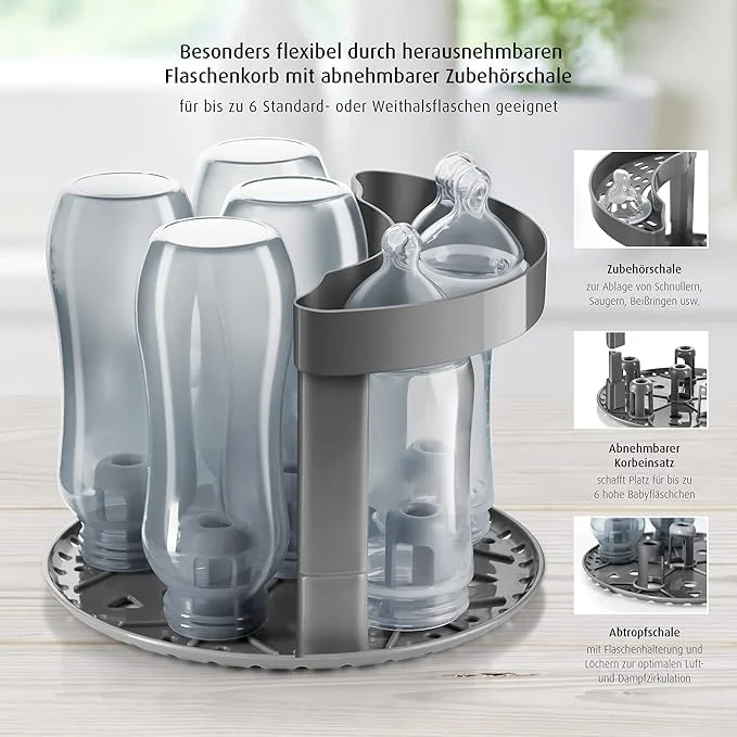 Idéal pour un usage quotidien, le VapoMat peut accueillir jusqu’à 6 biberons, quels que soient leur forme ou leur fabricant (y compris les modèles à col large et en verre). Il comprend également un panier pratique pour les petits accessoires comme les tétines et anneaux de dentition.