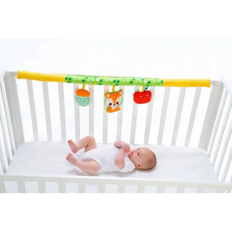 - 3 jeux suspendus amovibles en tissu, dont un avec un hochet, qui deviennent les premiers jouets du bébé