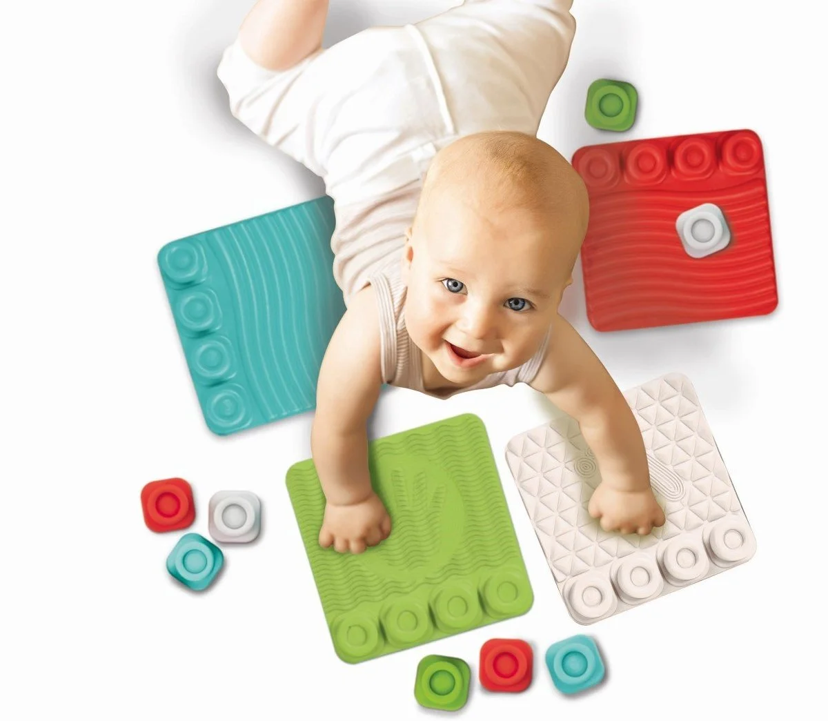 Une belle expérience tactile à vivre en assemblant les maxi pièces en caoutchouc souple, sûr et non toxique, conçues pour créer une expérience stimulante pour les tout-petits. La surface des pièces présente différentes textures en relief pour stimuler la perception tactile de l’enfant. Grâce aux formes Clemmy présentes sur les pièces, l’enfant peut assembler les briques entre elles pour créer des tours. Stimule la perception tactile, les capacités d’observation et les compétences manuelles. Un tapis pour éveiller les sens de bébé et pour qu’il joue en toute sécurité. 8 tapis et 8 briques souples à assembler pour que bébé découvre différentes formes et textures.
