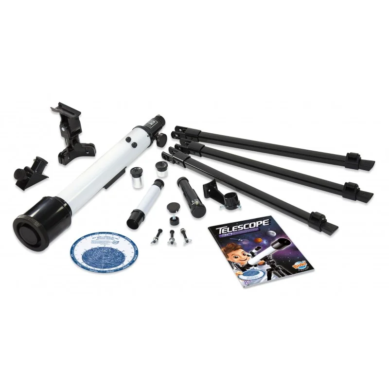 Inclus : 1 renvoi coudé, 1 monture, 1 tube principal, 1 trépied, 2 oculaires, 1 chercheur, 1 lentille de Barlow, 1 support du chercheur, 1 carte du ciel, 1 notice illustrée en couleurs.