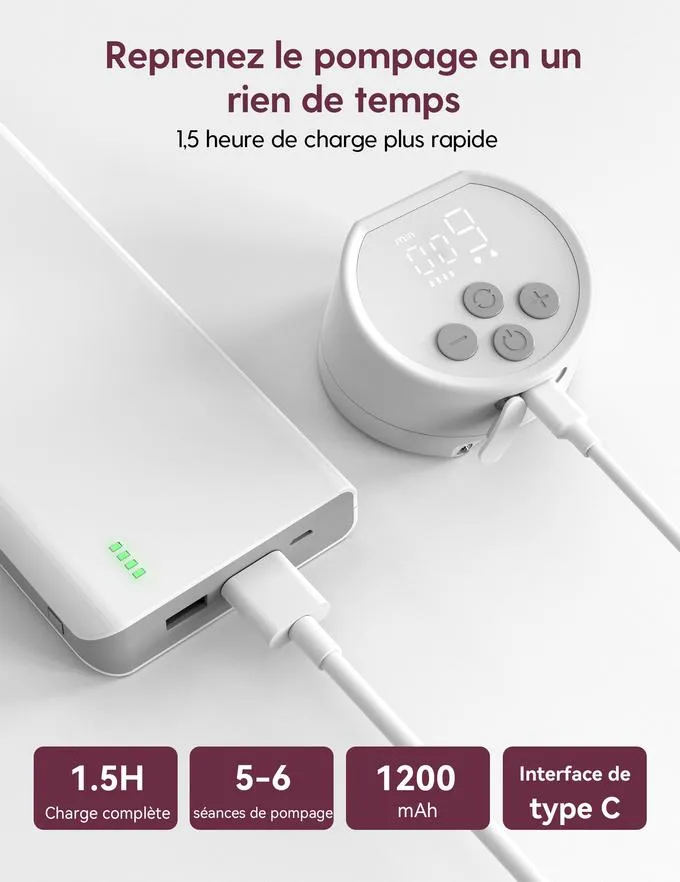 Les tire-lait électriques main libre S12 sont équipés d’une batterie rechargeable pour une utilisation sans fil pratique. La batterie peut être facilement rechargée avec le câble USB inclus, et offre une autonomie de plusieurs heures.