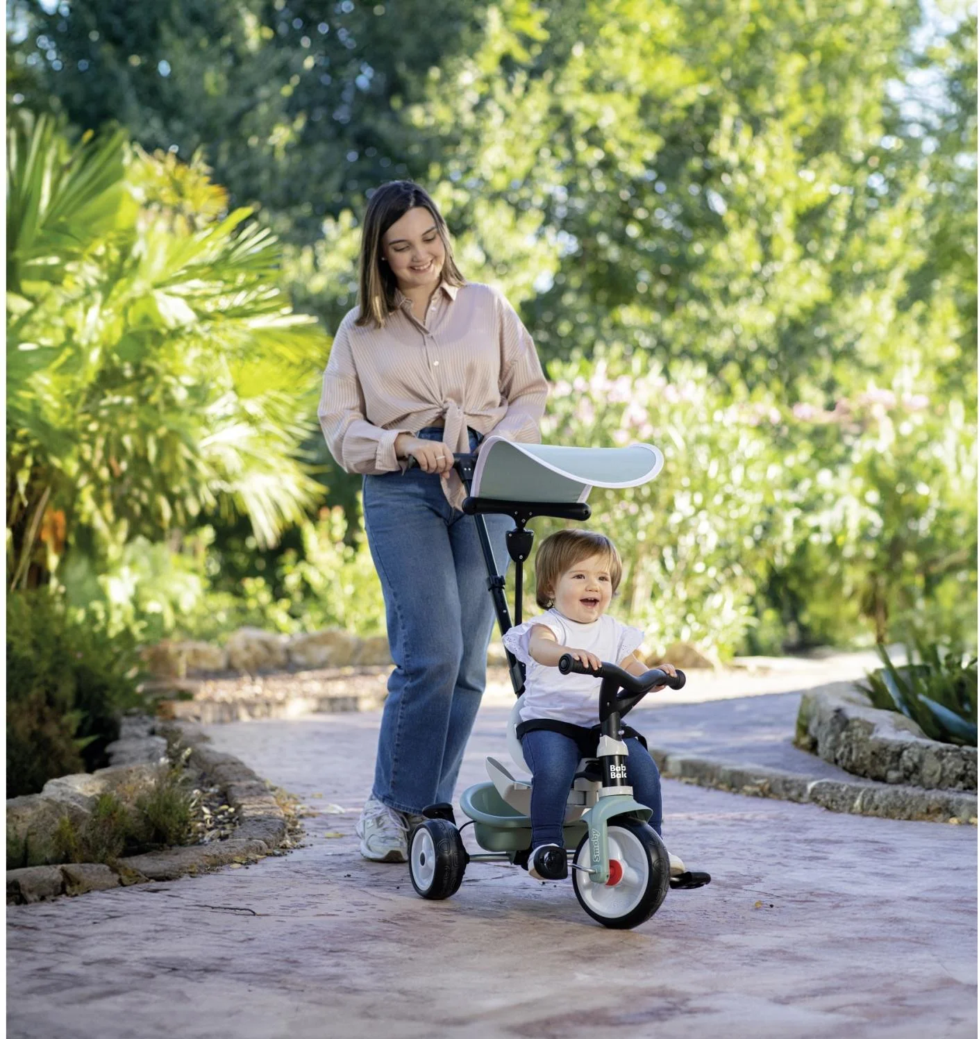 Confortablement installés dans le siège équipé d’un harnais de sécurité, les enfants adoreront partir en balade et jouer avec le klaxon de ce tricycle beige et vert. Pour le confort des parents, la poignée parentale à guidage intuitif peut être réglée sur 3 niveaux de hauteur (max 98cm) et permet de diriger le tricycle pour enfant très facilement.