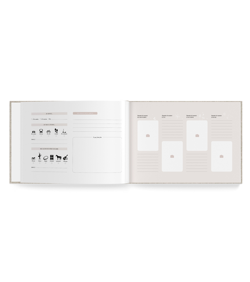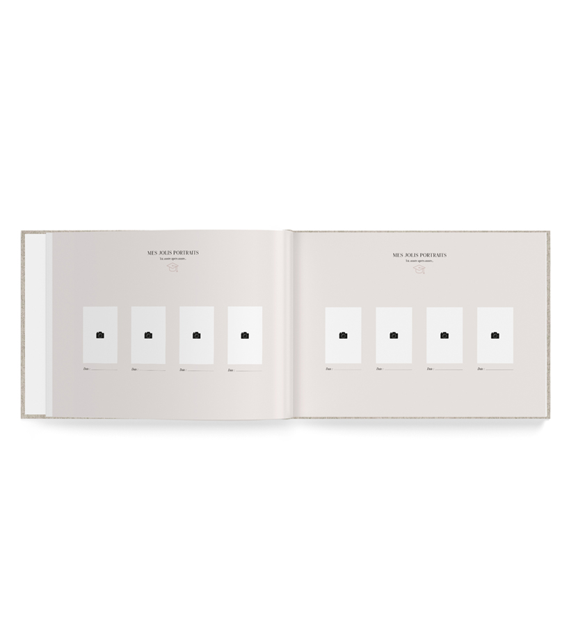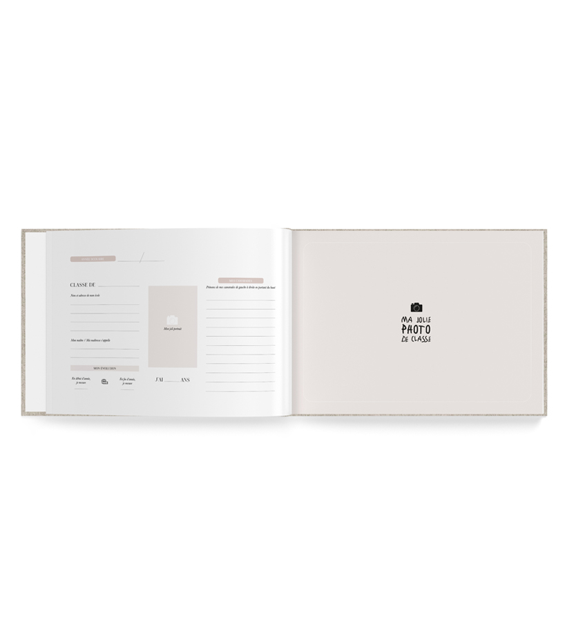 Un livre composé de 96 pages pour garder les jolis souvenirs de sa scolarité. Photos de classes, liste des camarades, photos, anecdotes…. DÉTAILS — Couverture en lin avec marquage à chaud blanc 23,8 x 30,5 cm – 96 pages Adapté pour des photos de classe d’un format maximum de 22,5 x 29 cm Contient 8 périodes scolaire non définies Papier qui garanti la gestion durable des forêts Couverture rigide, reliure dos carré cousue Pochon en coton assorti Fabriqué en France INTÉRIEUR — 8 périodes scolaires non définies contenant: · Photos de classe · Liste de camarades, meilleurs amis… · Détail…