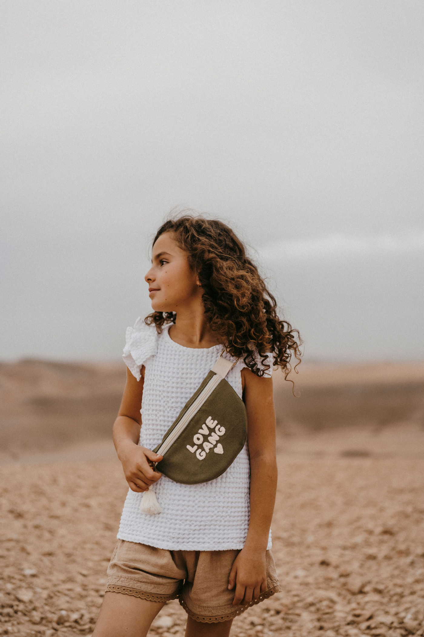 DESCRIPTION Découvrez nos adorables sacs banane pour enfants, parfaitement assortis à nos sacs cabas, pour des looks matchy matchy parent/enfant. Idéal pour les balades en famille, offrez à vos petits un accessoire amusant et pratique, tout en créant une belle harmonie avec vos propres tenues. Un duo parfait pour allier complicité et élégance lors de vos sorties ! CARACTÉRISTIQUES Dimensions: L 22,5 x H 15 x P 1,5 cm 100% coton Pompon amovible Pochon de rangement